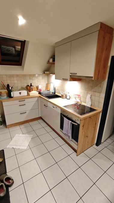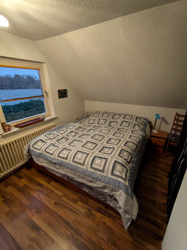Bad und WC befindet sich am Fuß der Treppe im EG. Unten ist auch noch ein 2. Bad was genutzt werden darf. Große Küche so wie Esszimmer für bis 4 Personen alles unten. Ein kleines TV Zimmer neben dem Esszimmer. Für den Wohnbereich bitte Hausschuhe mitbringen (Parkett).